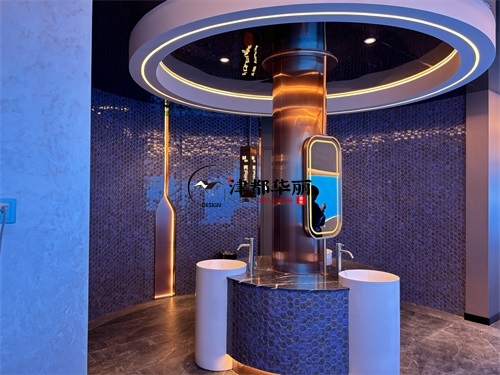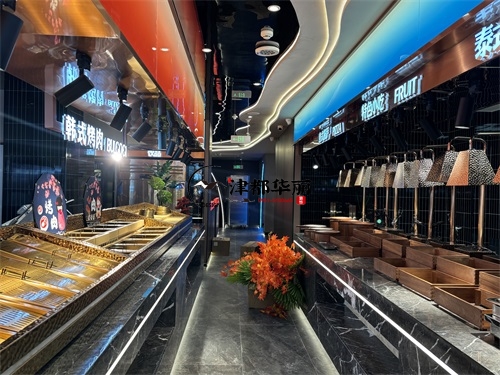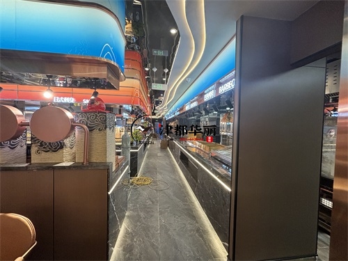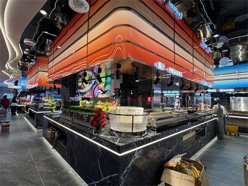 今天分享的是海原回香渔自助餐厅装修设计实景,这家自助餐厅装修设计将“潮流科技感”与“轻奢休闲风”两种风格巧妙融合在一起,既贴合当下年轻消费群体的审美偏好,又通过空间层次的营造兼顾了自助餐饮的功能需求,是近年餐饮空间设计的典型流行范式。前厅的顶面与墙面采用波浪形的曲面造型,搭配橙红、宝蓝等高饱和度渐变色彩,叠加内嵌式线性灯带的勾勒,既打破了传统餐厅的规整感,又通过科技感的光影营造出“赛博休闲”的氛围——这种手法既借鉴了网红餐饮的“打卡属性”设计,又通过色彩分区(如橙红对应热菜区、宝蓝对应海鲜区)实现了功能引导,让顾客能快速识别餐区类型。